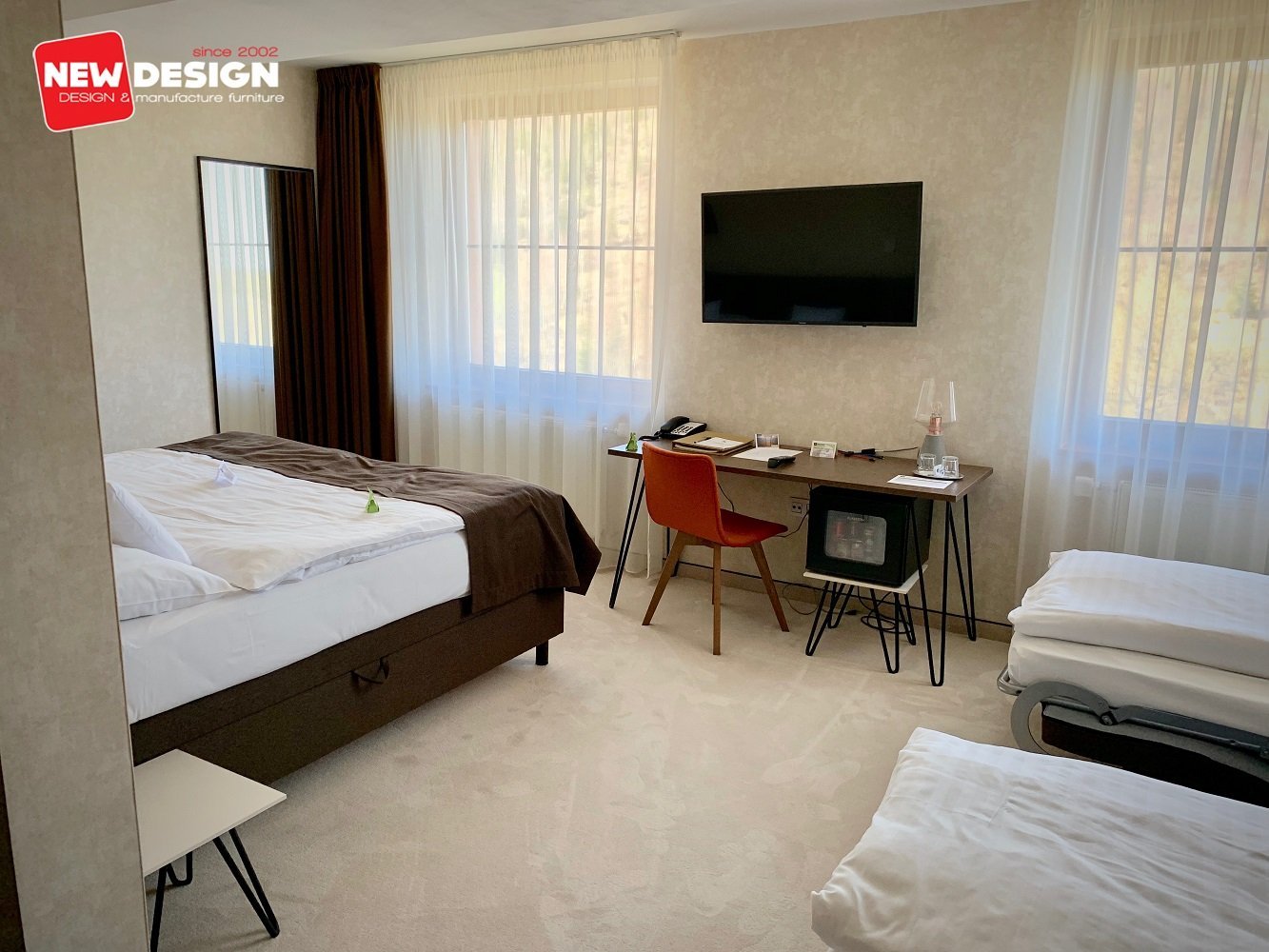 Ich súčasťou sú vešiakové skrine s policami, písací a konferenčný stôl. Spoločenské priestory dopĺňa jedálenská časť s barovým pultom,“ hovorí Andrej Chudík zo spoločnosti New Design, ktorá stojí za zhotovením unikátneho interiéru hotela.